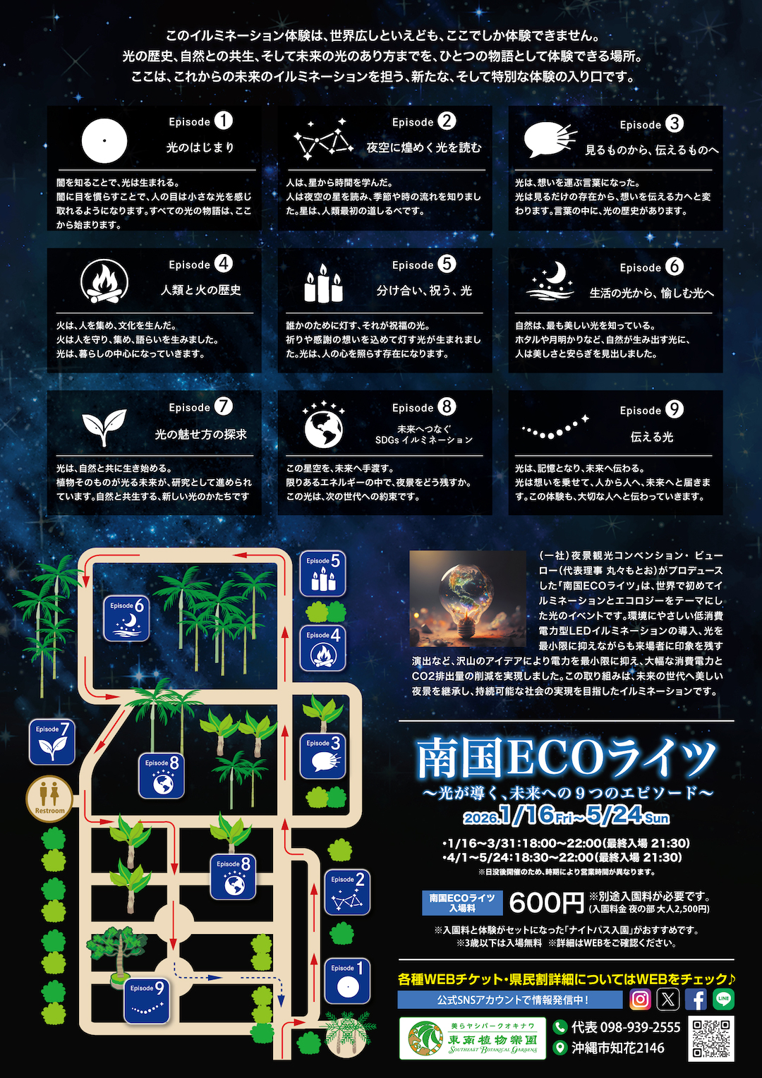 | Fee | Tropical ECO Lights Admission Fee: ¥600 *Separate park admission is required. (Park admission – Night Session: Adults ¥2,500) |